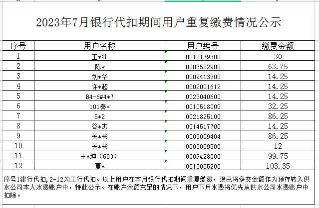 2023年7月銀行代扣期間用戶重復繳費情況公示