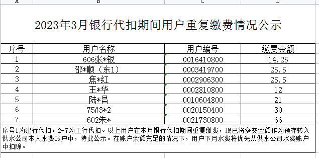2023年3月銀行代扣期間用戶重復繳費情況公示