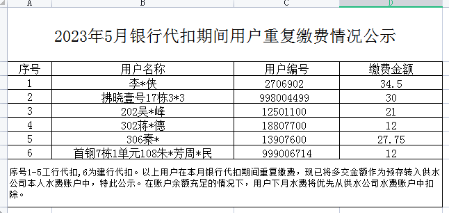 2023年5月銀行代扣期間用戶重復(fù)繳費情況公示