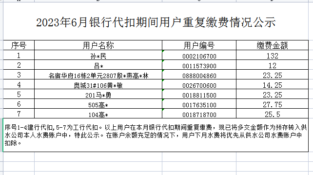 2023年6月銀行代扣期間用戶重復繳費情況公示