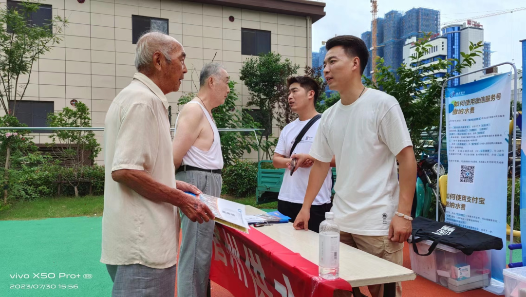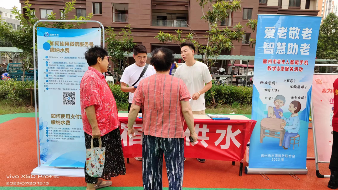 在宿州供水公司的展位上,來自售水部、信宣中心的志愿人員正在為用戶講解網上查詢和繳費的知識,幫助用戶正確使用微信服務號,讓用戶體驗供水網上服務平臺帶來的便利。